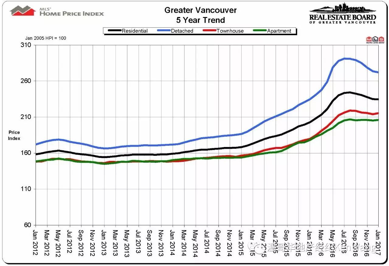 大温哥华地区1月份独立屋的销售,原以为会受到来自海外买家的积极的影响,结果最终只成交了444套物业,较一年前下降了57.6%。目前独立屋的基准价为$1,474,800,较过去六个月下跌6.6%,较2016十二月下跌0.6%。市场上房屋供应量上升的速度很快。大温地区新挂牌销售的住宅物业在2017年1月份共有4140套。这一数字较一年前下降了6.8%,但比2016年12月份上升了215.5%。2017年1月份市场上挂牌物业的售出率为21%,这是大温地区近两年来的最低值。分析人士说,当售出率长期低于12%的时候,房价会有下行的压力。而当这个数值连续几个月处于20%以上时,房价往往会遭遇上行压力。