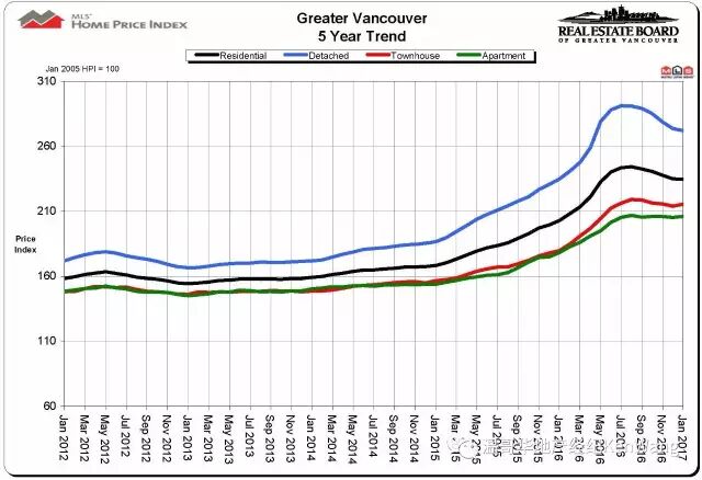目前在大温哥华房地产市场上,不同类型的物业表现截然不同。联排别墅和公寓的市场远比独立屋市场要活跃。当独立屋价格有所下跌的时候,排屋和公寓的价格仍保持稳定。2017年1月份的公寓销售同比去年同期下降了24.7%,比一年前下降了2017,但在过去的六个月里,公寓的基准价为$512,300,仅下降了0.3%,比十二月还上涨了0.4%。